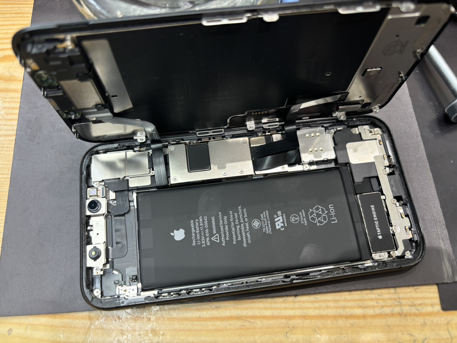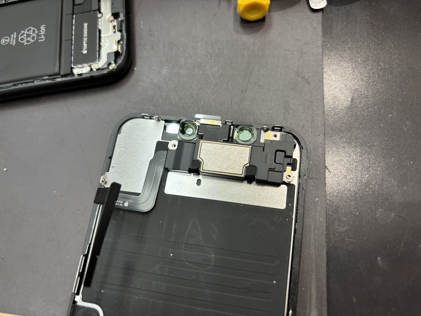 無事に画面が開いたらバッテリーの接続を外して画面を取り外します。画面にはフロントセンサーという部品が付いており新しい画面へ移植する必要があるので慎重に取り外します。
