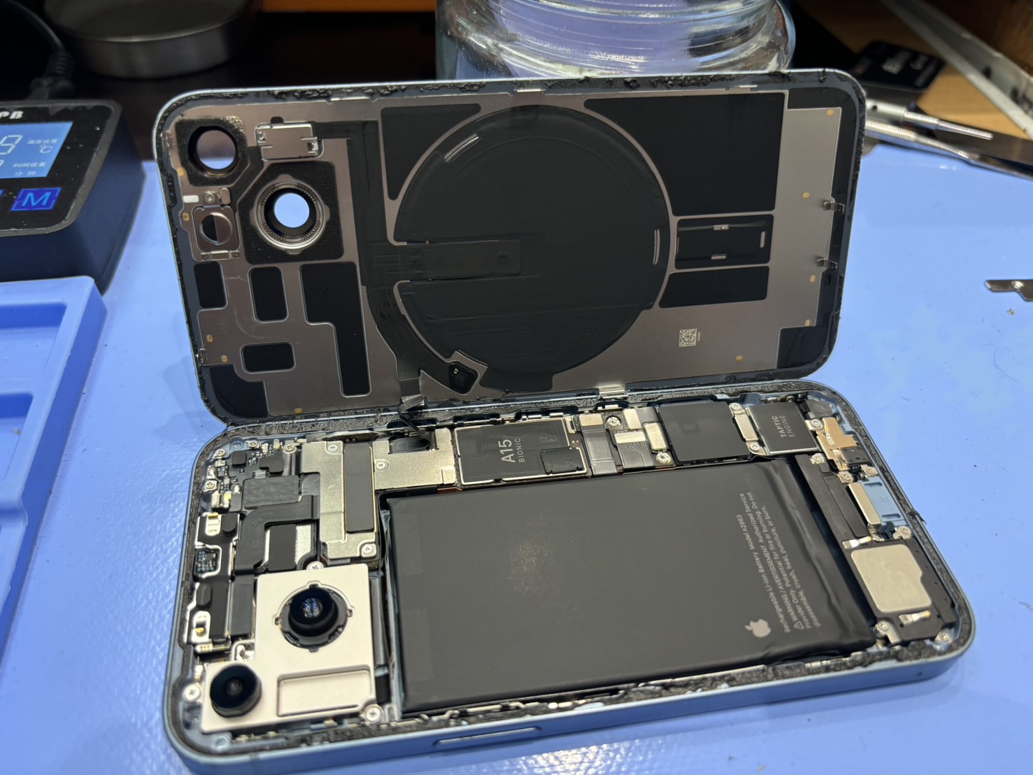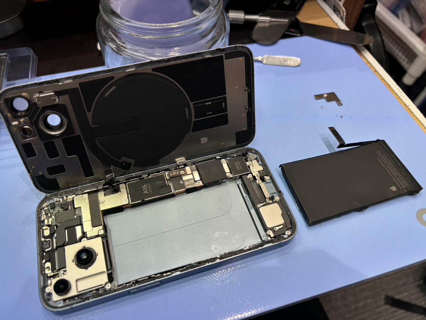 iPhone14を分解するにはまず背面パネルを開けます。背面パネルは縁が粘着で留まっていますが、パネル自体は表面がガラスなので割れやすいです。力任せには開けず慎重に開けていきます。
