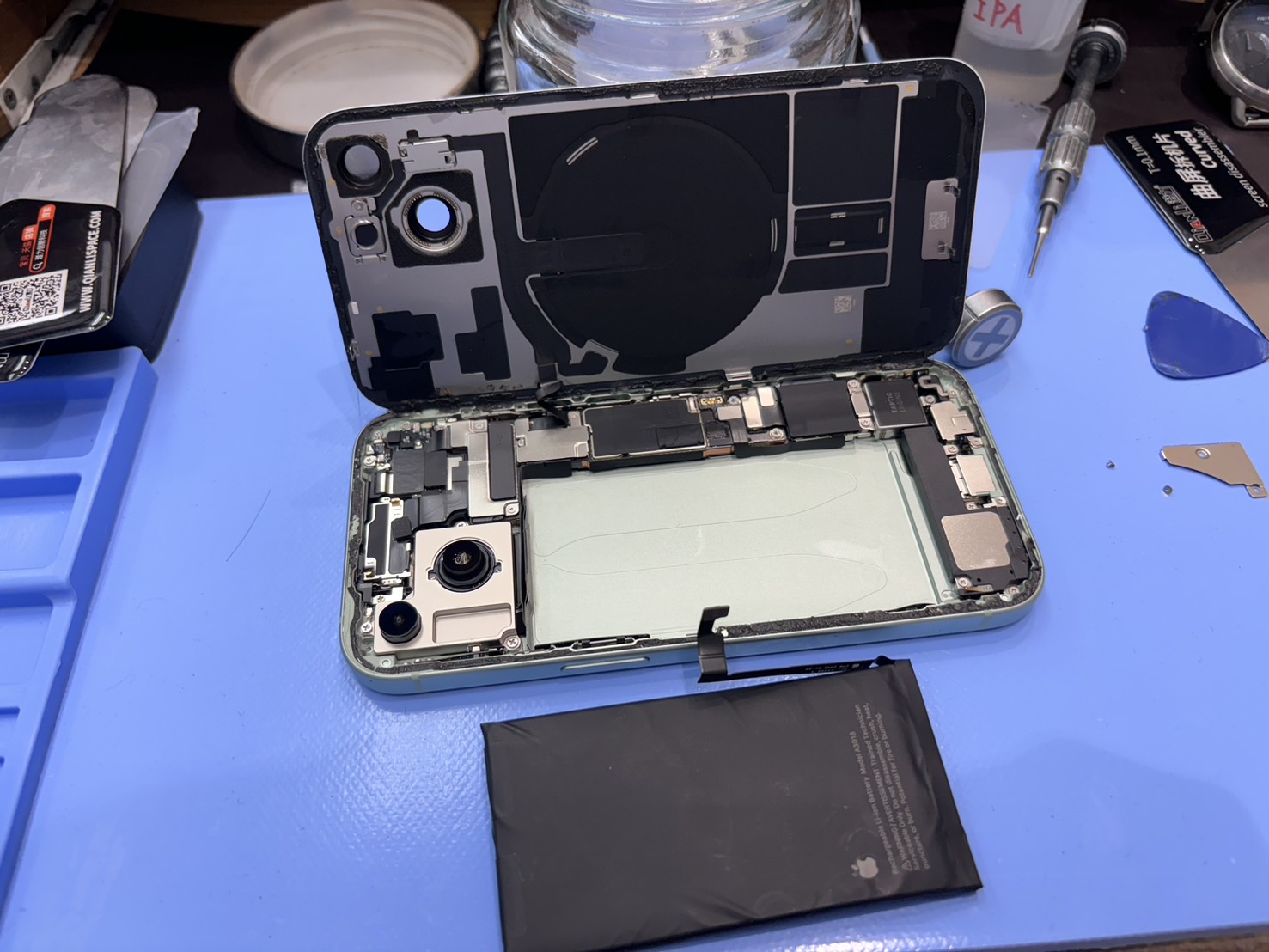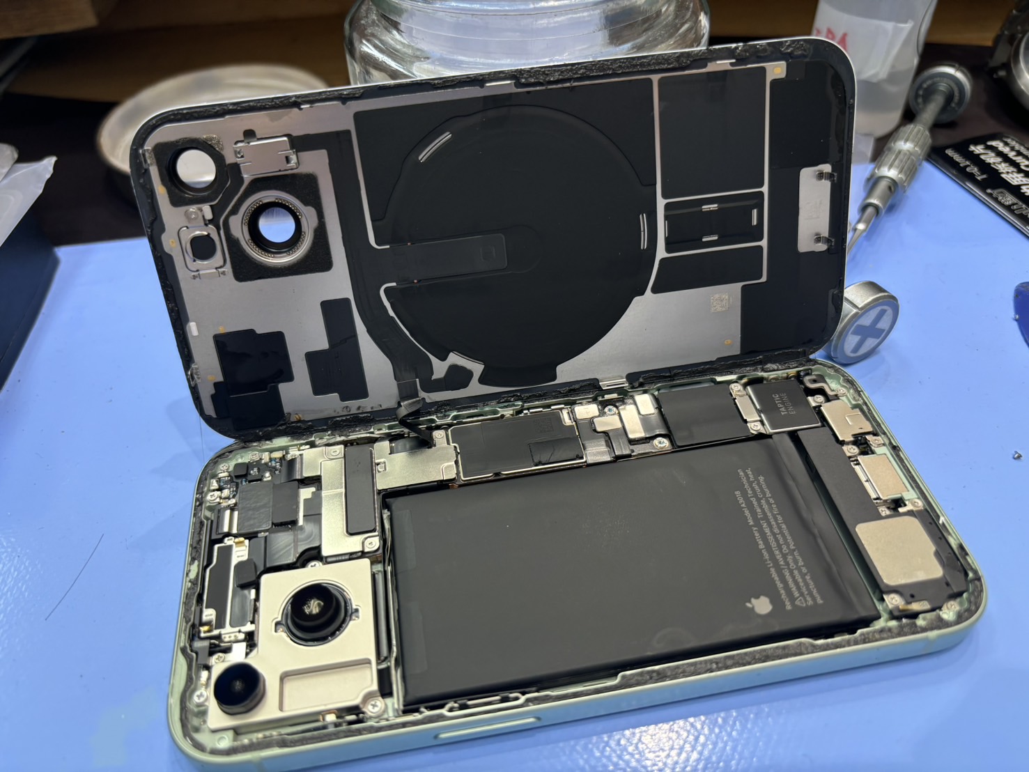 iPhone15の修理を行なう際にはまず背面パネルを開けるところか開始です。